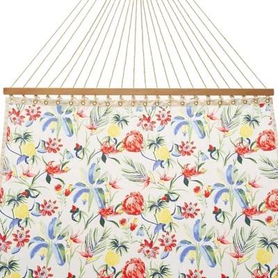 Relax and unwind after a long day while enjoying the outdoors with this Tropical Single Layer Fabric Hammock from Threshold™. Made from weather-resistant single layer fabric, the tropical hammock comes with a heavy-duty hanging stand that offers reliable strength to hold up to 500 pounds. Affix this hammock between two trees or out on the back patio and kick back to read a novel, have a drink, take a nap or gaze at the stars.