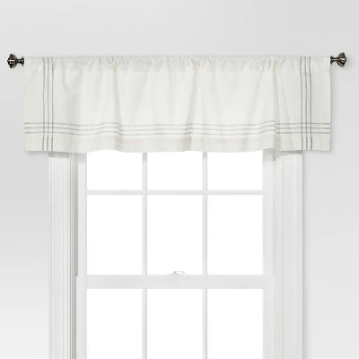 Dress up your windows with this Striped Border Window Valance from Threshold™ to add the perfect finishing touch to any room. The neutral color scheme and simple striped design makes for an ideal window treatment, as it adds the perfect amount of detail to any window without distracting from other decor elements. The rod pocket makes installation a breeze and conceals the curtain rod for a complete, unobtrusive look, and the valance can be hung alone or paired with blinds of your choice.