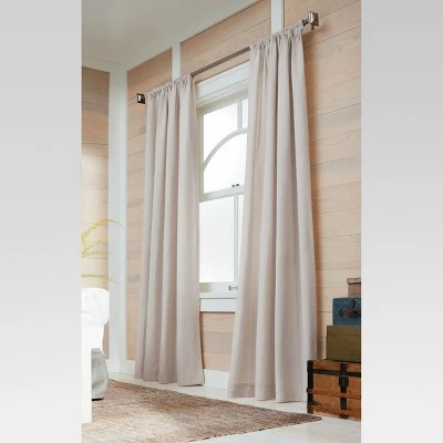 Transform your living space with this Farrah Curtain Panel from Threshold™. The soft fabric-blend curtain panel comes in a solid color with a textured finish that mixes easily with a variety of decors, and the light-filtering fabric lets just the right amount of light in while enhancing privacy. The curtain is machine-washable for easy upkeep, and the rod pocket design lets you pair it with your choice of curtain rod for versatile styling. Whether you hang it in your living room, den or three-season porch, you’ll love the crisp look this panel adds to your space.