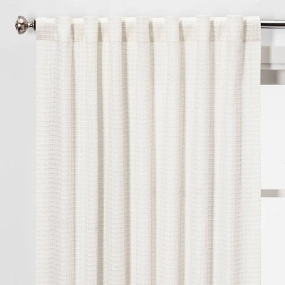 Create a clean, fresh look in any room of your house with this Honeycomb Light-Filtering Curtain Panel from Threshold™. The curtain panel features a stylish yet subtle honeycomb pattern in white that mixes easily with a variety of decors, and the light-filtering fabric lets just the right amount of light in while enhancing privacy. The curtain is machine-washable for easy upkeep, and the back-tab design lets you pair it with your choice of curtain rod for versatile styling. Whether you hang it in your living room, den or three-season porch, you’ll love the crisp look this woven panel adds to your space.