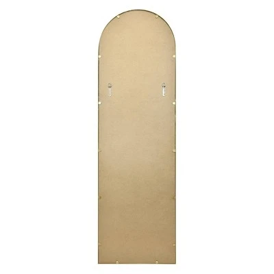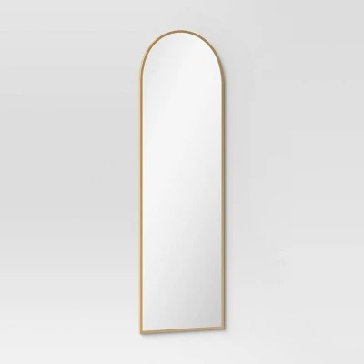 Add instant glamour and interest to your space with the Arched Steel Leaner Mirror from Threshold™. This wall-mount mirror has a timeless rectangular silhouette with an arched top for added intrigue, and is encased in a gleaming gold metal frame for a touch of glam shine. Whether you want to create an illusion of extra space in your entryway, use it as a functional accent in your closet or display it in your living room, this mirror is sure to make a statement in your space. Provided hanging instructions explain the two ways this mirror can be hung your wall or leaded against a wall using the provided anti-tip kit.