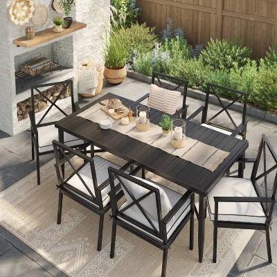 Create the outdoor dining space you’ve dreamed of with the addition of this 2-Pack of Searsburg Aluminum Dining Chairs in Black by Threshold™. Each of these two weather-resistant outdoor dining chairs are made from black powder-coated aluminum and feature the comfort of armrests as well as an on-trend chic mid-century modern-inspired look. The set also includes two matching seat cushions made from soft fabric with contrasting black piping along the seams. Whether you use them to dine a deux or as part of a larger dining set, you’ll love the way these chairs elevate your patio or porch space.