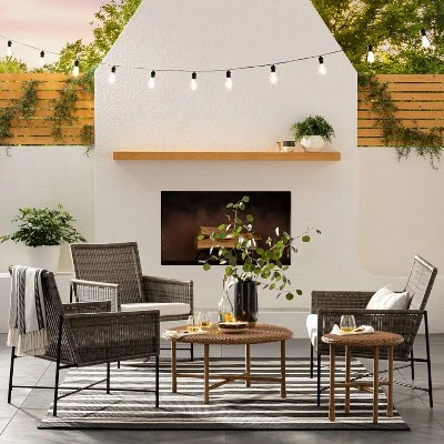 Add simple yet stylish seating to your outdoor space with the 2-Pack Wicker & Metal X-Frame Patio Accent Chairs from Threshold™ designed with Studio McGee. Featuring an attractive blend of mixed materials, these boxy patio accent chairs are designed with wicker uppers for a stylish textured look, while sitting on weather-resistant steel frames with a modern-looking X-shaped base. Included patio cushions help provide a more comfortable seat, and they’re made of DuraSeason Fabric™ that resists fading, repels water and offers easy cleaning and care.
