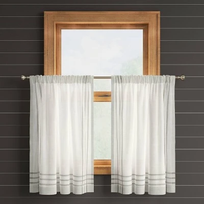 Whether you place them over the kitchen sink window or in your bathroom, these Striped Border Curtain Tiers from Threshold™ are ideal pieces to tie any room together. Perfect for allowing just the right amount of sunlight into a room, these lovely woven window curtains add simple detail with their neutral color and clean stripes. The 36-inch by 42-inch dimensions completely cover smaller windows, and the rod pocket makes hanging the curtain tiers easy and conceals the curtain rod for an unobtrusive look.