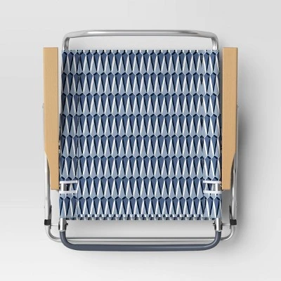 Create your comfort for lounging at the beach or in the backyard with the 5-Position Beach Chair with Aluminum Frame and Wood Arms from Threshold™. This portable beach chair is designed with a metal frame and printed upholstery to add to the comfort and style. Easy to set in five different positions, this rust-resistant beach chair is great for outdoor use and convenient to move and store with its foldable design.