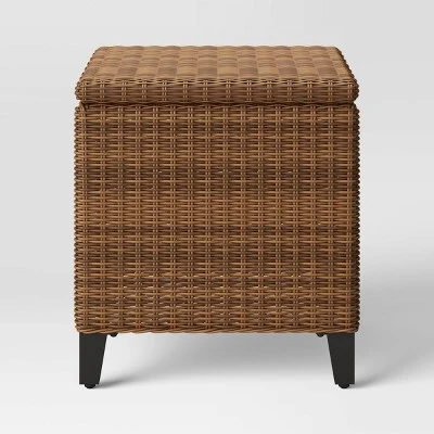 Bring function and style to your outdoor seating with this Brookfield Patio End Table with Storage from Threshold™. Made with a metal frame, this outdoor end table is made from all-weather, rust-resistant wicker to help it withstand the elements. Featuring a cubical silhouette with a rectangular tabletop that provides a base to place snacks or drinks or keep a small potted plant or vase, this wicker patio end table features a removable lid to offer you extra storage space.