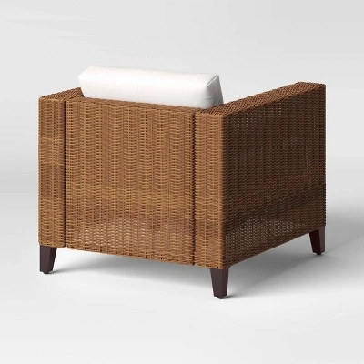 Whether you’re soaking up the winter sun or reading in the afternoon sun, you’ll love the comfortable style of this Brookfield Steel Wicker Club Chair with Cushions from Threshold™. Featuring a dark brown woven wicker frame constructed in the classic club-chair design, this cushioned patio chair combines elegant appeal with timeless flair for a compelling accent. The cushioned seat and back offer cozy support, while the weather-resistant construction withstands the outdoor elements, making this chair a functional addition to your outdoor space.