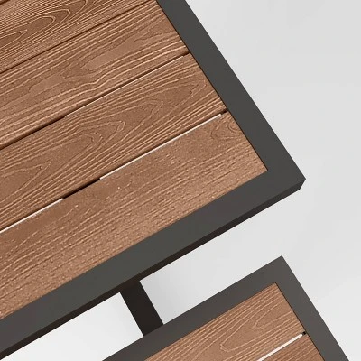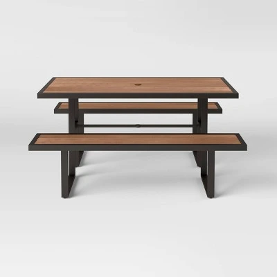 Create a perfect gathering spot in your patio with this Bryant Faux Wood Square Patio Picnic Table from Project 62™. Set on a gray metal frame, this picnic table features a wooden tabletop that contrasts with the frame for a mixed-material appeal. The table comes with joint benches and an umbrella hole to complete your outdoor setting. And with the fade-resistant design, this square picnic table withstands outdoor elements to help you enjoy outdoor weather in all seasons.