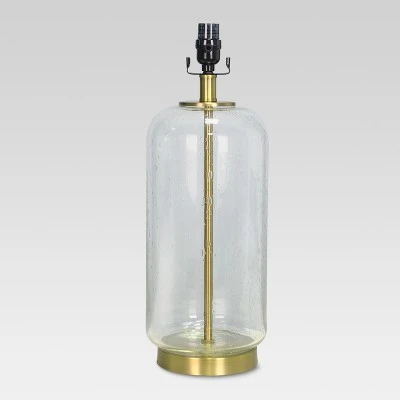 Start off your custom lighting design with the unique style of the Bubble Glass with Brass Detail Large Lamp Base Clear Includes Energy Efficient Light Bulb from Threshold™. Showing off a stylish mixed-materials design, this large table lamp base includes a three-way rotary switch that allows you to keep the light at a high, medium or low setting. Enjoy the versatility of this sturdy metal and glass lamp base, and easily complete the look with your choice of shade.