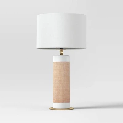 Upgrade your indoor lighting with this Ceramic Table Lamp with Natural Wrap White from Threshold™. This stylish table lamp features a natural wrapped white ceramic base for two-toned appeal. The white fabric shade exudes a soft, warm glow when turned on and finishes off the modern look, while the on/off light setting with a rotary socket switch allows for easy function. Place it on the side table next to your sofa or console in your living room or entryway for an inviting glow.