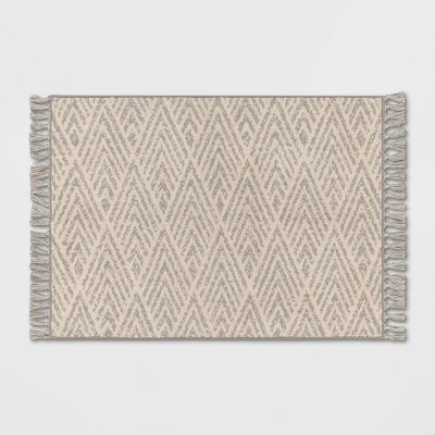 Add textured flair to your indoor space with this Diamond with Fringe Accent Rug from Threshold™. Featuring an allover diamond pattern with tassels on each end, this knitted accent rug blends in easily with your existing decor while adding warmth and texture to your floors. Designed with a latex backing to keep it in place, this fringe accent rug is a highly versatile choice that’s easy to place in your living room, hallway, study and more.