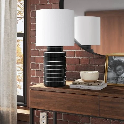 Light up your interiors with this Glossy Table Lamp from Threshold™. This ceramic table lamp features a cylindrical base in a navy glossy finish with white stripes for chic, contrasting style. The white linen drum shade completes the crisp look, while the on/off light setting with a rotary socket switch allows for easy functionality. Place it on any side table, console or sideboard for stylish, warm lighting.
