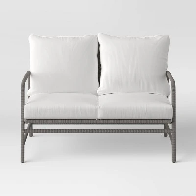 The Granby Padded Wicker Patio Loveseat from Threshold™ offers an easy way to instantly upgrade your outdoor space. Made with a metal frame wrapped in woven weather-resistant wicker for a minimalist yet inviting look, this padded patio loveseat provides comfortable and convenient seating for up to two people. Included seat and back cushions offer a soft, comfortable place to kick back and relax in your backyard or on your deck. The versatile color palette pairs easily with wicker or metal patio side tables so you’ll have a convenient spot to set your morning cup of coffee or a good book you’re enjoying in your own outdoor oasis.