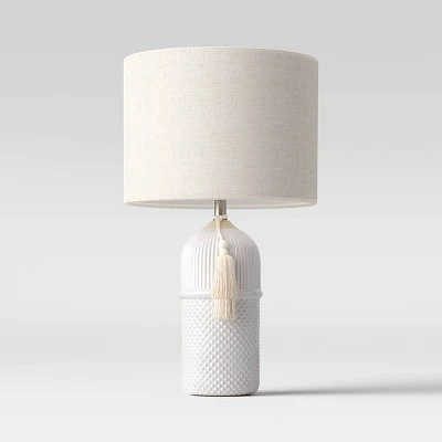 Add light and style to your home with this Large Assembled Ceramic Table Lamp from Opalhouse™. This accent table lamp features a mix of embossed patterning with tassel detailing on a ceramic base to bring stylish lighting to any space. This table lamp comes with a socket rotary switch for easy on and off, and the white drum shade diffuses soft lighting into your home. A perfect blend of modern styling with traditional elements, this table lamp will instantly impact the design of your console or entryway table.