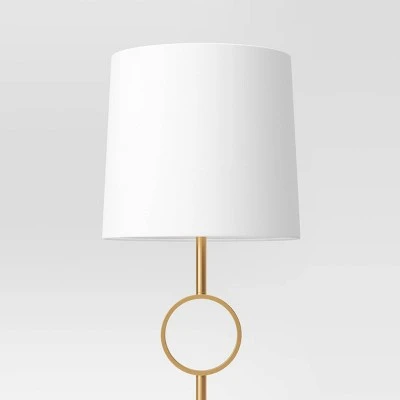 Upgrade your indoor lighting style with this Metal Ring Floor Lamp from Threshold™. This stylish floor lamp features a metal ring pedestal base for a unique, chic look. The white drum shade gives a soft glow for everyday use, while the brass finish fits with a variety of decor styles. Place this floor lamp next to your armchair, sofa or any other piece of furniture in your home to illuminate your space.