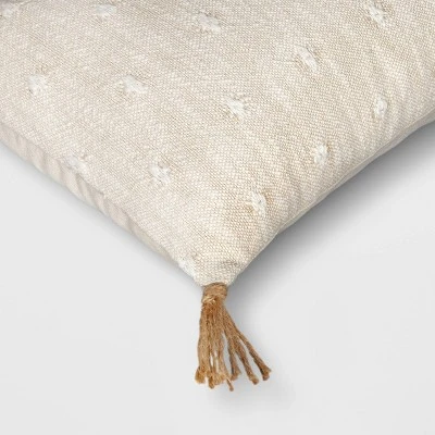 Bring timeless style to your living room decor with this Oversized Woven Jacquard Lumbar Throw Pillow with Tassels from Threshold™. This rectangular throw pillow comes enveloped in a soft, cotton-blend jacquard fabric with filling for cushioned comfort. Designed with knife-edge detailing for a crisp look, it features a jacquard-weave pattern with tassels on each corner to add eye-catching flair to any chair it’s tossed on. Best of all, the removable cover makes cleaning a breeze.