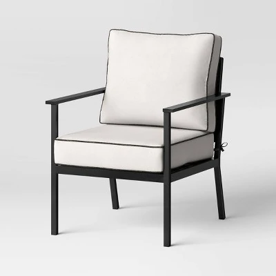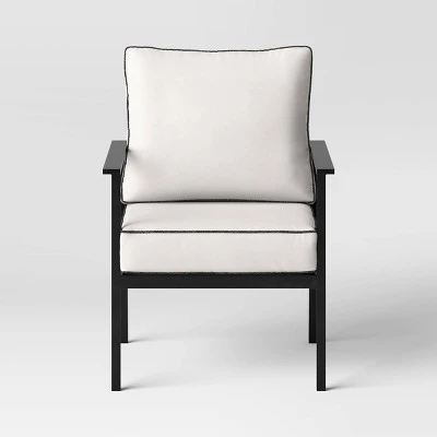 Create a cozy conversation area in your outdoor space with this Searsburg 3-Piece Aluminum Patio Chat Set in Black from Threshold™. Made from black weather-resistant, powder-coated aluminum, this set is composed of two club chairs and a square, glass-topped accent table. The club chairs are padded with 100% polyester cushioned seats and backrests that are covered in white fabric for contrast and comfort.