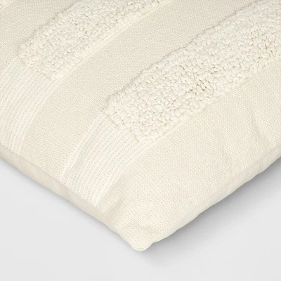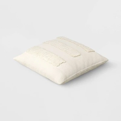 Add some boho vibes to your living room or sitting space with this Textural Woven Striped Square Throw Pillow from Threshold™. This decorative pillow showcases woven striped bands with tufted accents for a pleasing aesthetic. Featuring a 100% cotton exterior with soft filling, it’s sure to add comfort and style to your sofa, chair or bench.